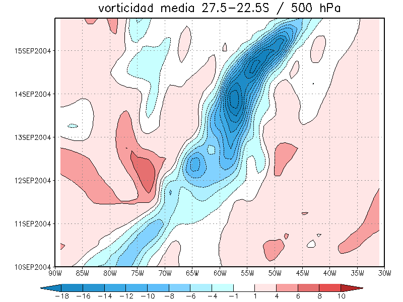 la vorticidad relativa en 500 hPa promediada en la banda de latitud 22.5S -